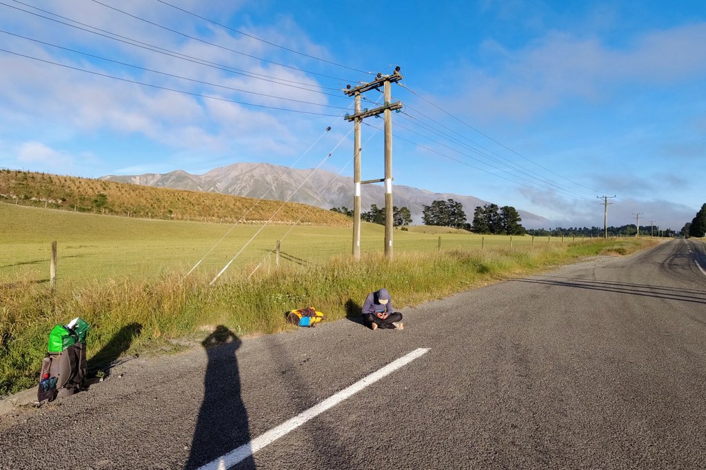 6時半にシャームと出発し、歩きながらヒッチハイクを試みると、最初に止まった車にポールが乗っていてびっくり!(笑)。ポールはLAKE COLERIDGEからメスバンへ向かう途中だそうで、数キロほど乗せてもらいジャンクションでおろしてもらった。