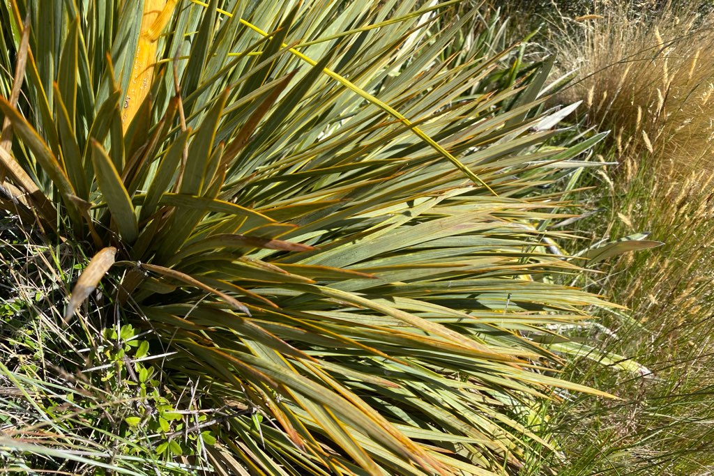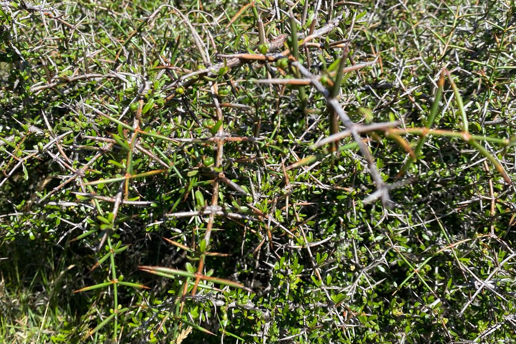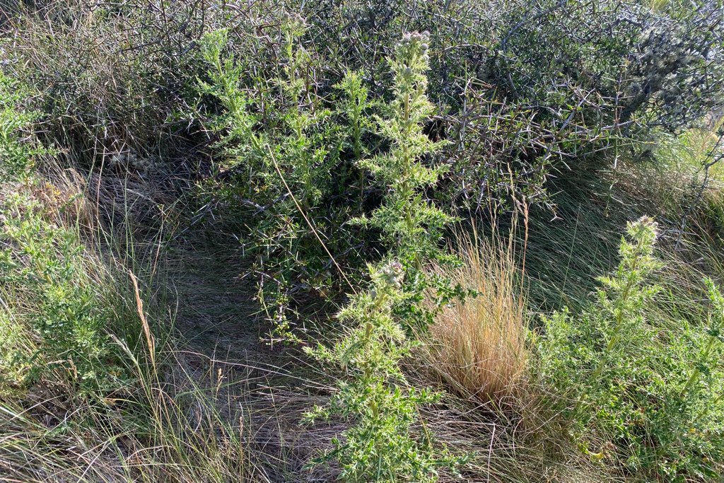 途中からスパイキーな草の多い道を歩くことになる。下の画像「痛い植物3」で少し血が出た。ピーク直下は草が茂り、見えにくい地面に足を取られて何度か穴に落ちた。足元が泥だらけになり、また水で洗い流されながらも進む。砂の崖をトラバースして草をかき分け、ようやくピークを超えた。