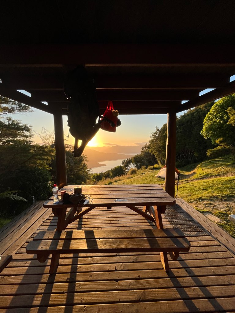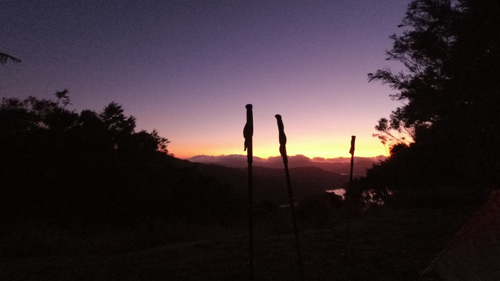 夜中、何度もポッサムの音で目が覚めた。それでも、朝5時の目覚ましでしっかり起き、テントを開けると目の前には美しい朝焼けが広がっていた。あまりの美しさに、すぐにテントから出て朝食を持ってシェルターに移動し、朝焼けを眺めながらのんびりと食事を楽しんだ。そんな風にゆったりと過ごしている間に、気づけば一緒にいた他のハイカーたちはすでに出発していた。