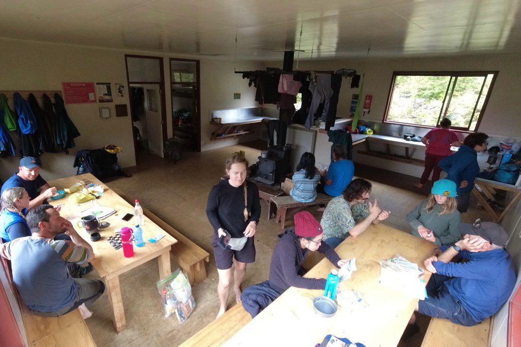 12時前にUpper Travers Hutに着くと、0 day組のハイカーたちがストーブに火をつけており暖かかった。薪割りを手伝いながら、自然とみんなで談笑する流れになり、今日はここに泊まることに決めた。雨の音が外で響く中、ストーブのそばで過ごす時間は穏やかで、山中での貴重なひとときだった。