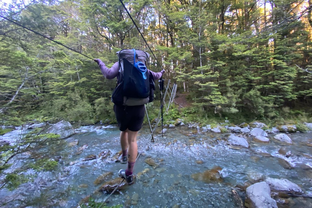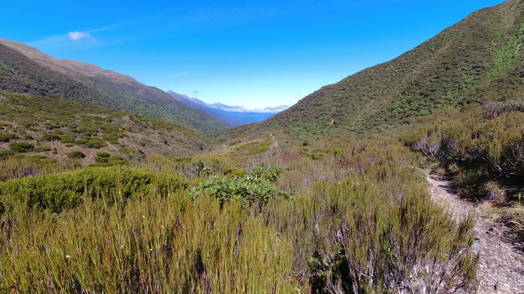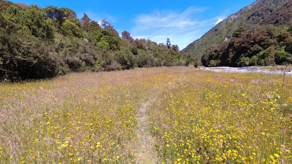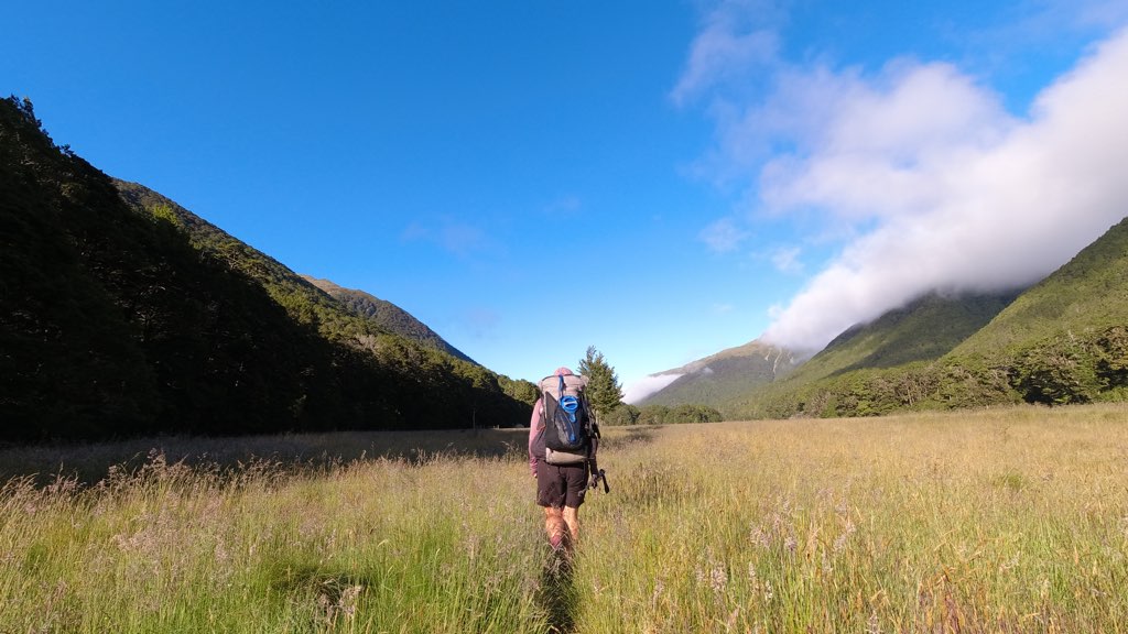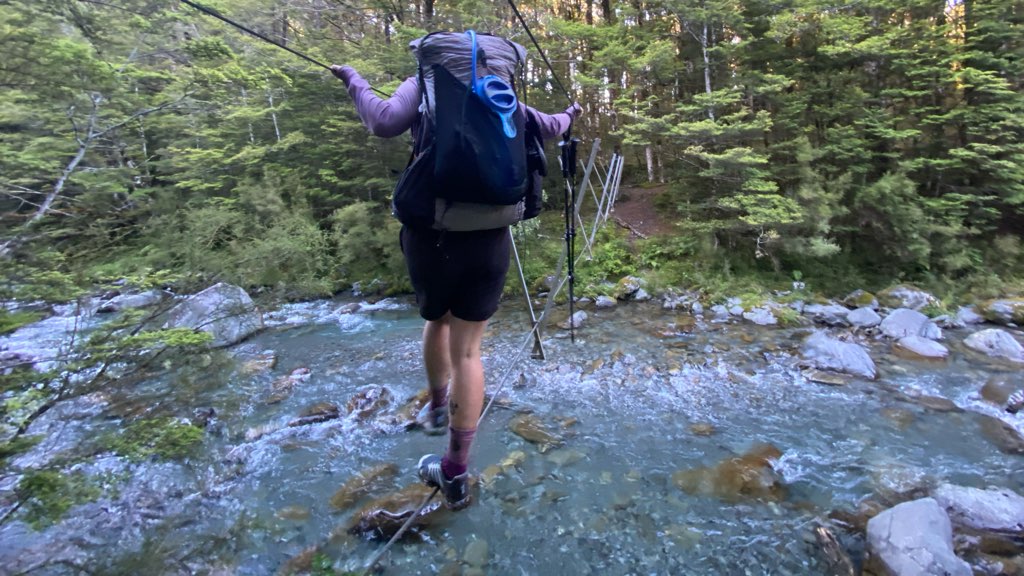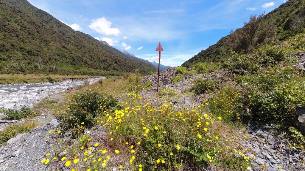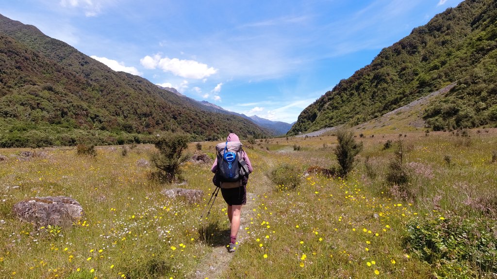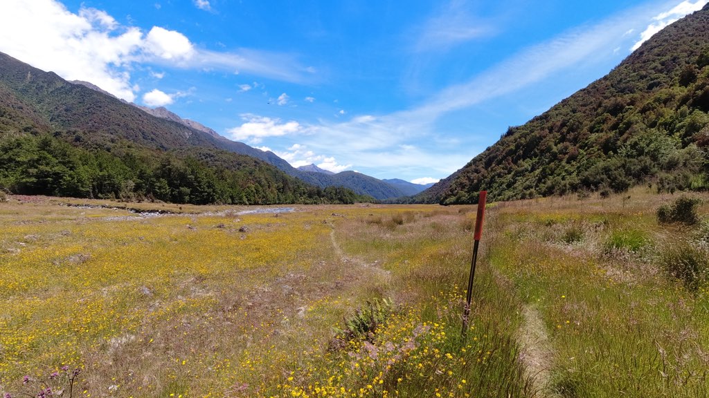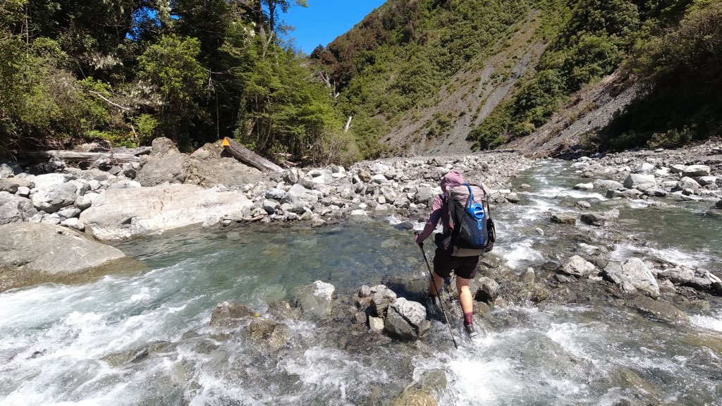 Harper Pass Bivvyに10時前に到着し、少し休憩して20分後に再び出発。川沿いの道は小川が流れている部分もあり、何度も靴が完全に浸水した。それでも緩やかな道が続き、歩きやすかった。