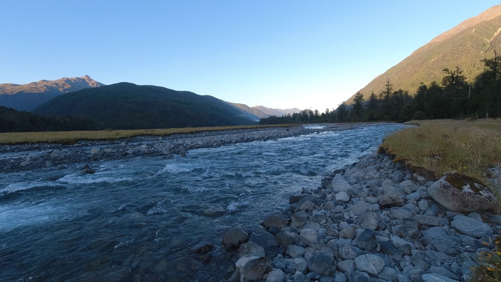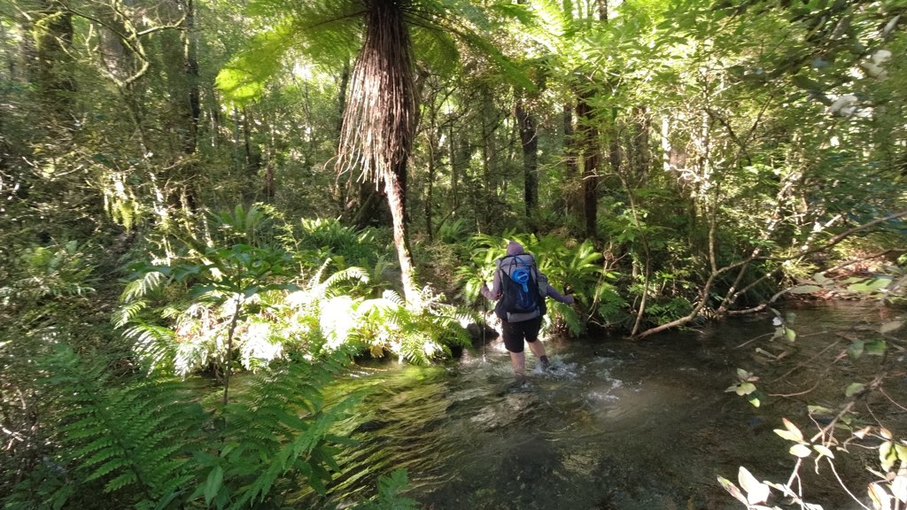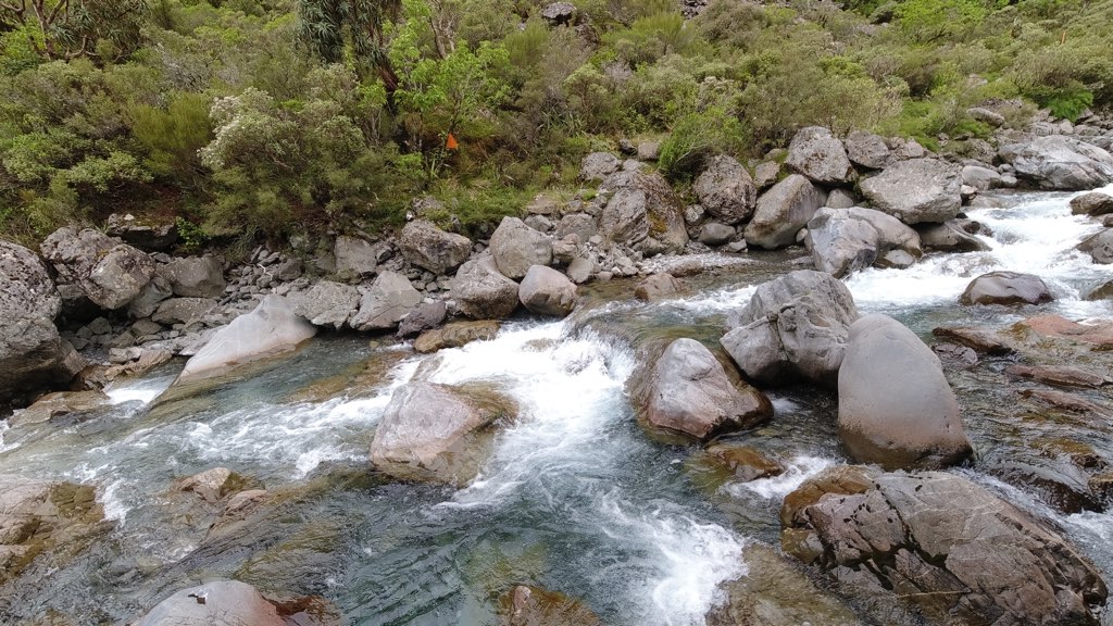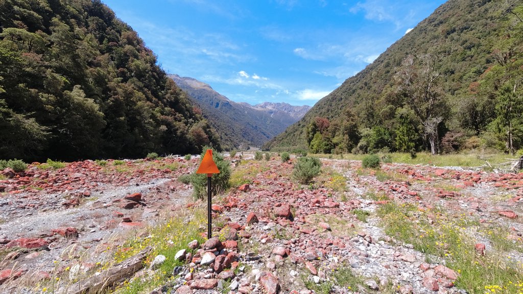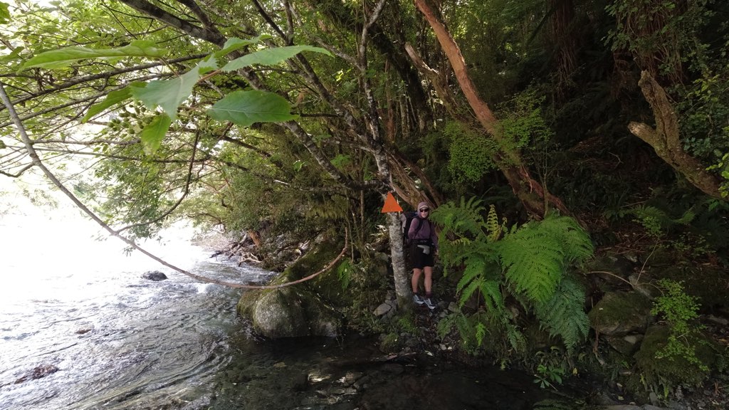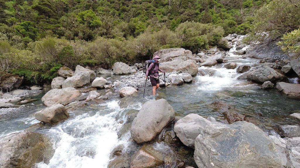 Kiwi Hutから川沿いを歩いて行く。河原に到着し、渡渉のため渡れそうな箇所を探しながら川沿いを進んだ。川は意外と簡単に渡れて、深さは股下ほどだった。他のNOBOの話では、膝くらいの深さの場所もあるらしい。