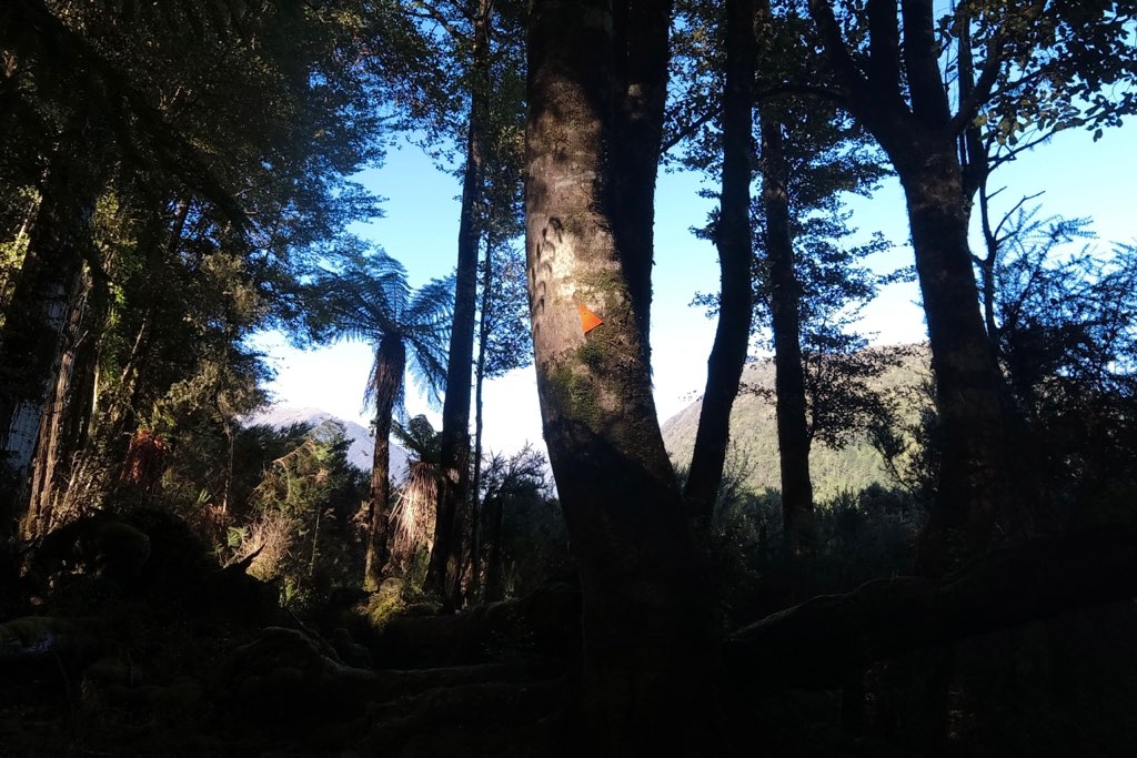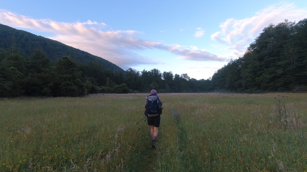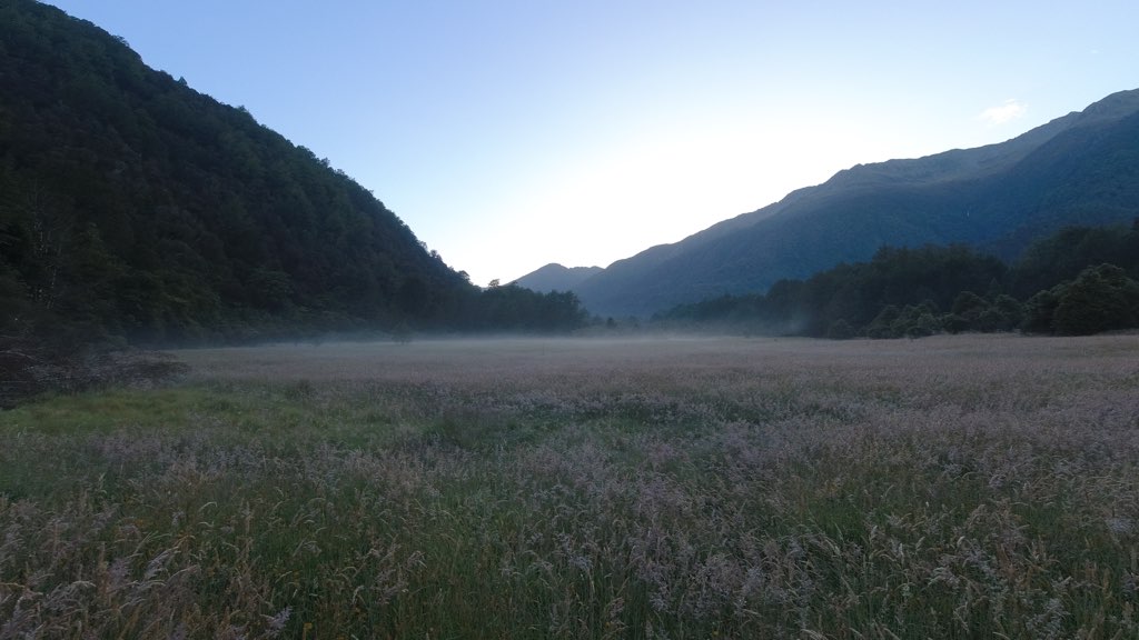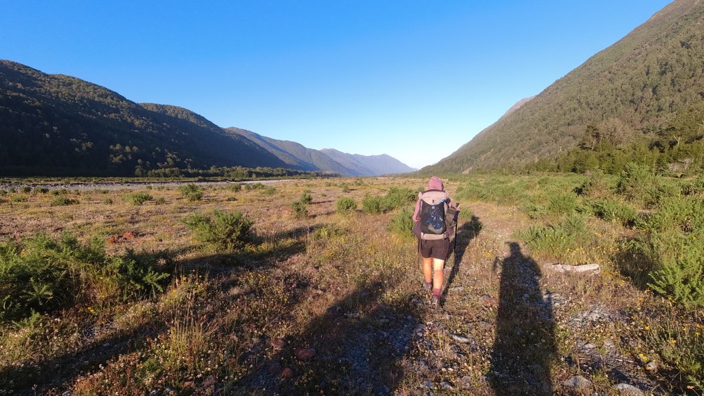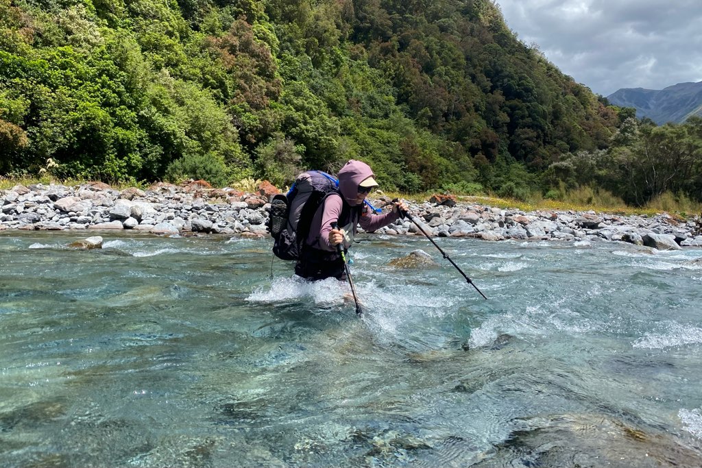 Kiwi Hutから川沿いを歩いて行く。河原に到着し、渡渉のため渡れそうな箇所を探しながら川沿いを進んだ。川は意外と簡単に渡れて、深さは股下ほどだった。他のNOBOの話では、膝くらいの深さの場所もあるらしい。