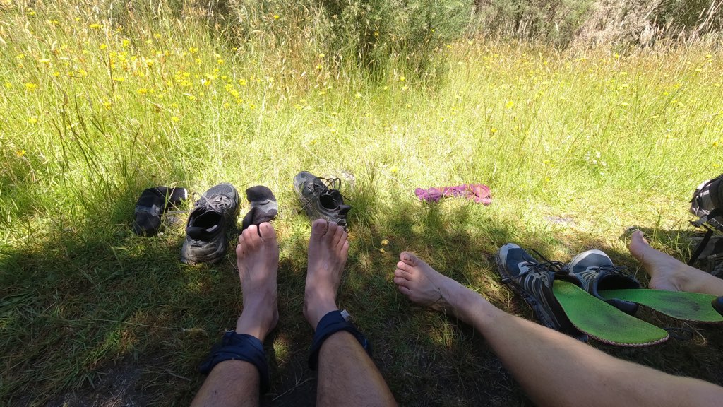 河原歩きは、時折トレイルがあったり、ゴースが生えている場所もあるが、基本的には石や岩の上を歩いて進むため、足の裏が疲れてくる。