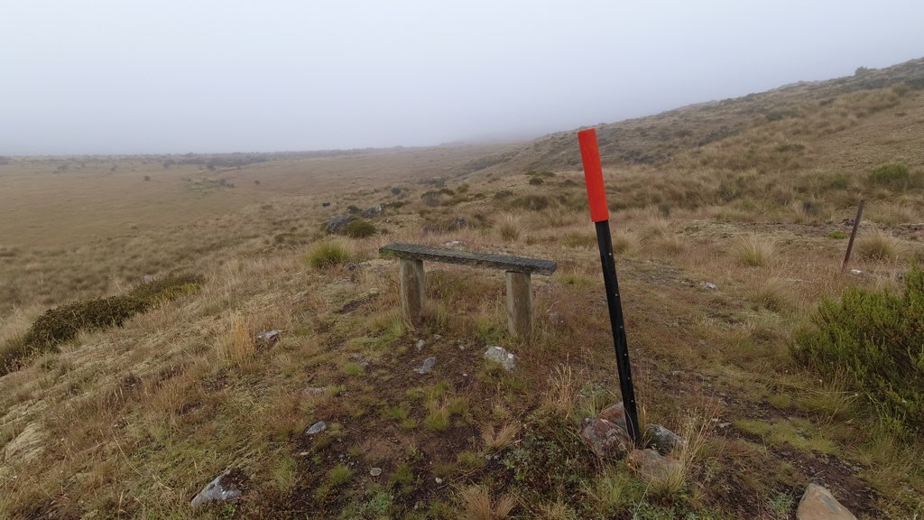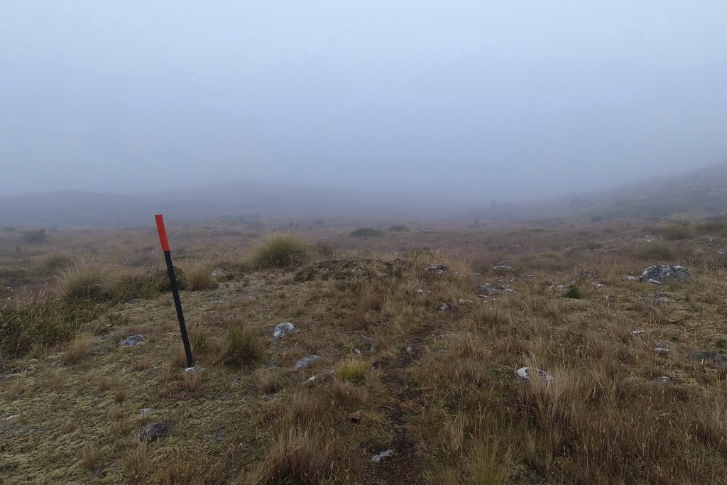 Farout(地図アプリのコメント)にはオレンジ色のポールを目印に進むよう書かれていたため、ポールを頼りに歩き進める。霧がまだ道を覆い、視界は白一色だ。